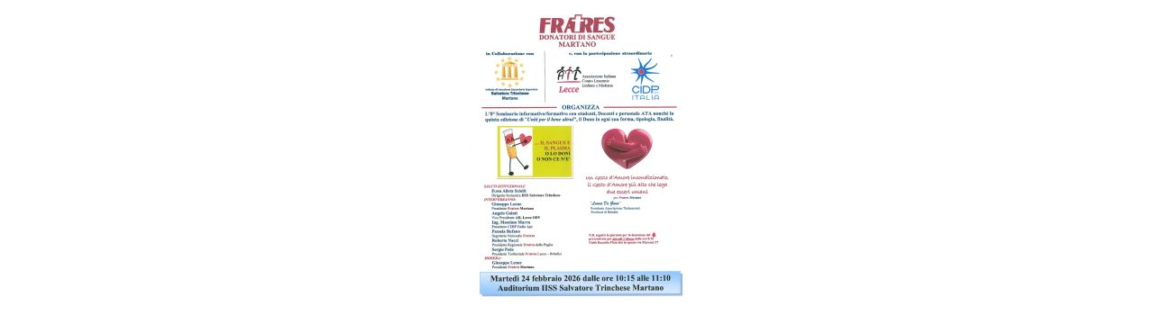 Il Gruppo Fratres Martano "Dina Manco Matteo" (LE) in collaborazione con Istituto di Istruzione Secondaria Superiore Salvatore Trinchese Martano e con la partecipazione straordinaria della Associazione Italiana Contro Leucemie Linfomi e Mieloma e CIDP aps ITALIA organizzano, Martedì 24 Febbraio p.v. il Seminario dalle ore 10:15 circa di cui alla locandina allegata.